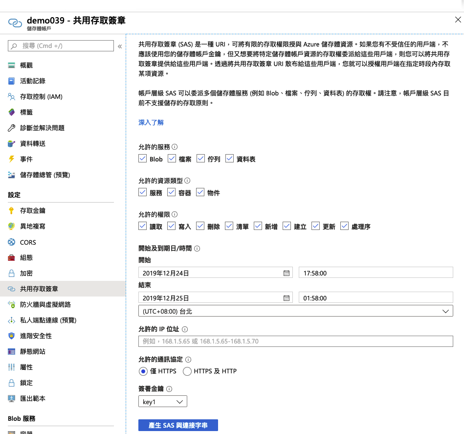 要取得 container 等級的共用存取簽章(SAS)可以在進入 storage 管理頁面後點左邊的 [共用存取簽章],設定要該簽章能夠使用的權限範圍以及簽章有效時間